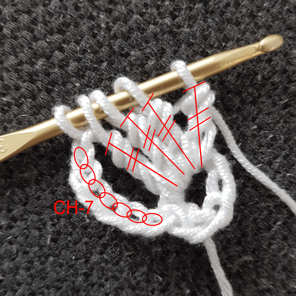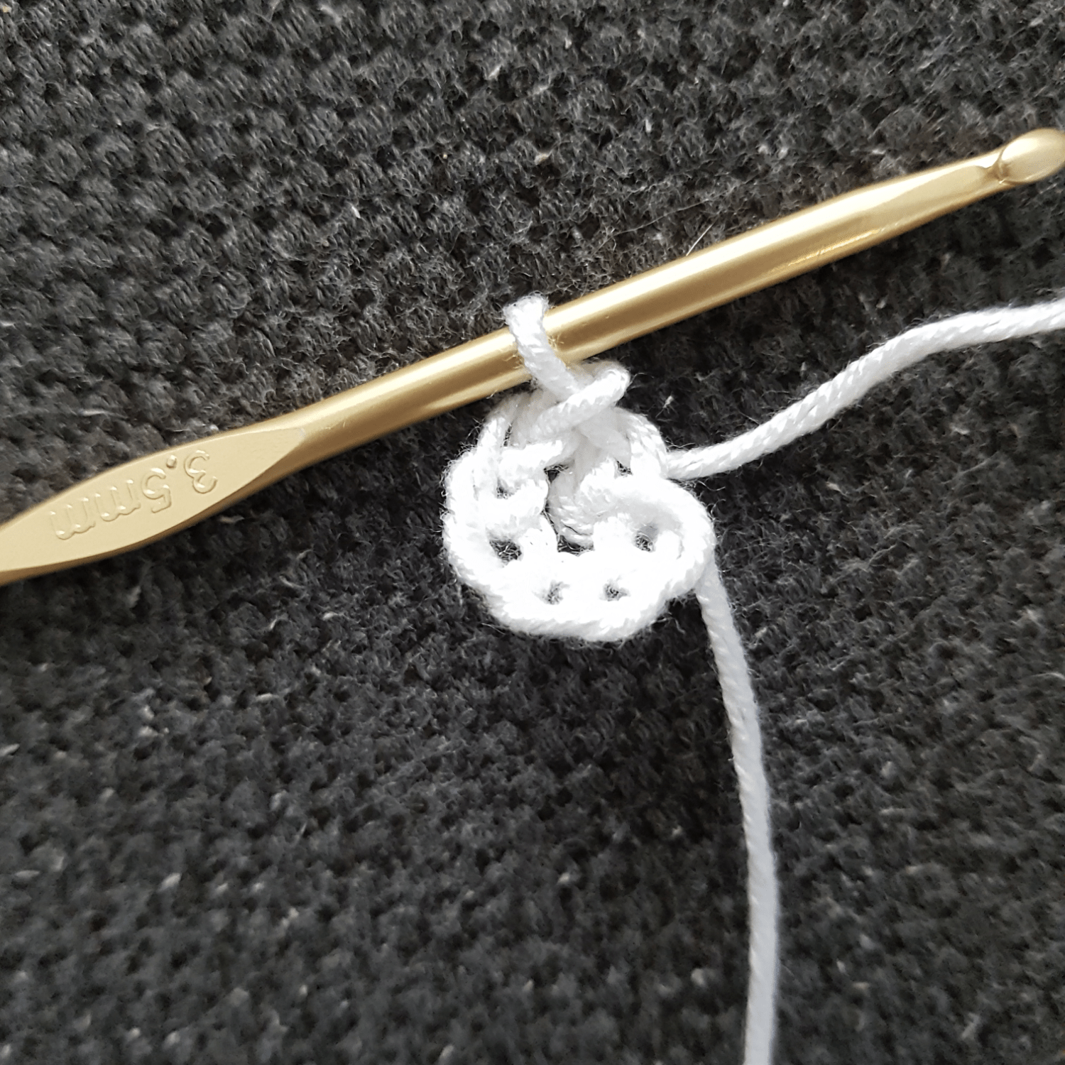 Haak een ketting van 7 losse. Haak een halve vaste in de eerste losse en sluit de ring.
