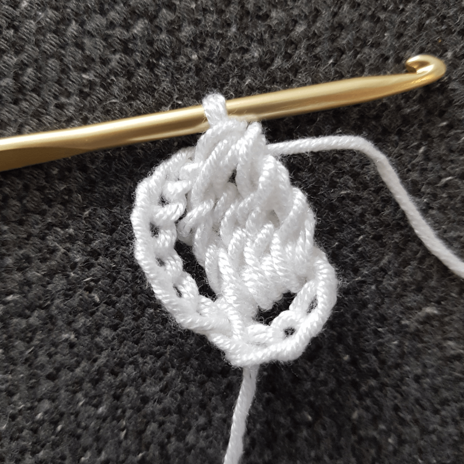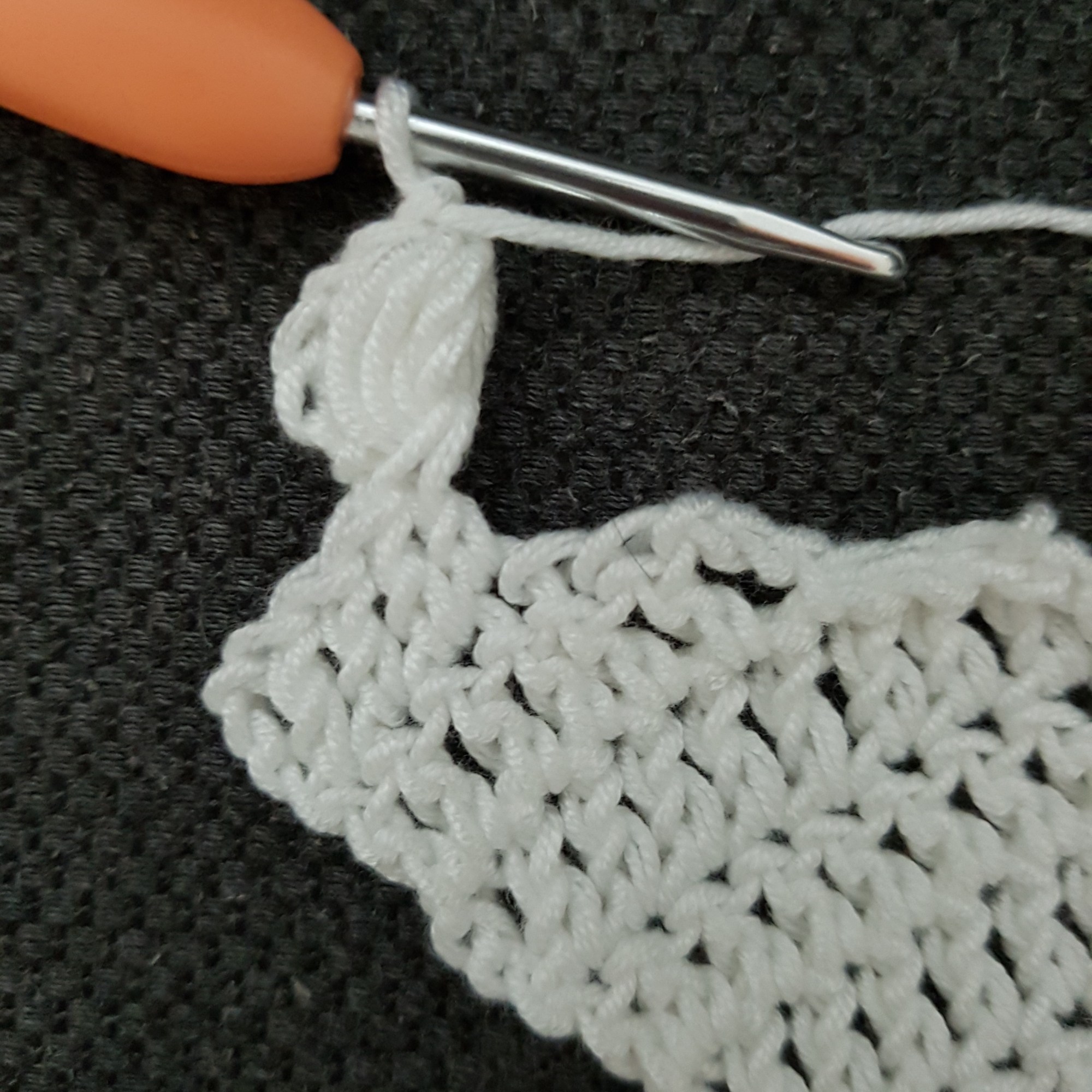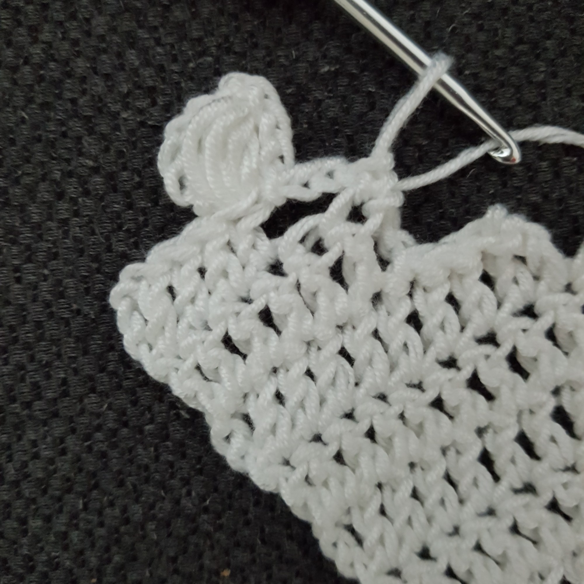 Haak 5 losse, haal de draad door de eerste steek en trek hem wat hoger op, sla draad om de naald en herhaal dit nog 4 keer, dan haal je de draad door alle lussen en sluit met een vaste. Haak 5 losse, haak een halve vaste in de eerste steek, haak 3 losse, haak 1 vaste in de hoek van de volgende rij. Herhaal tot je tot het midden van de top bent gekomen.