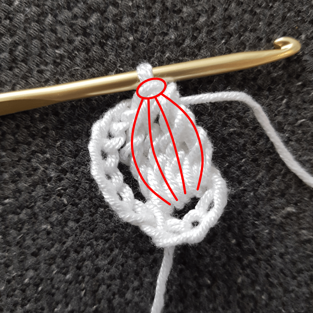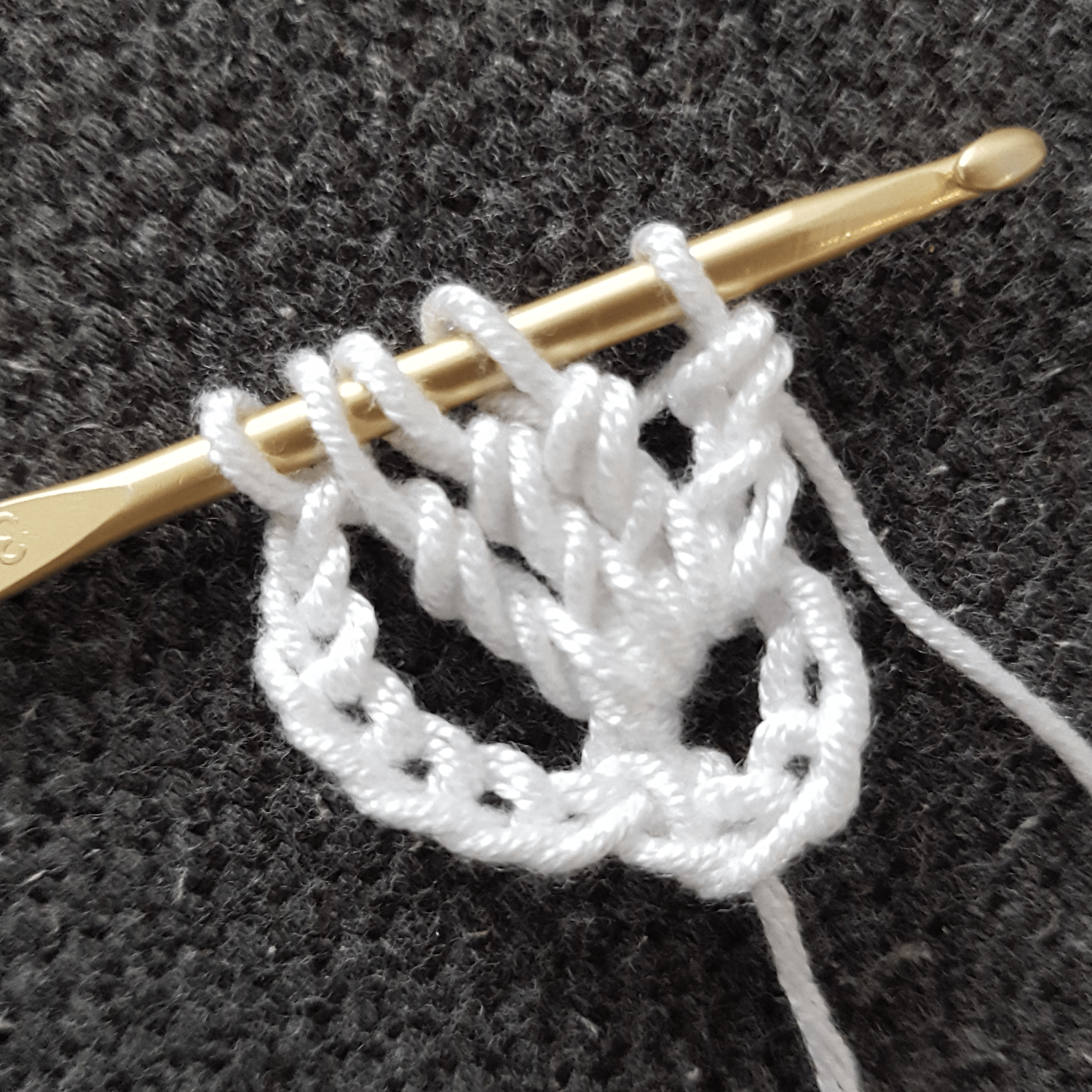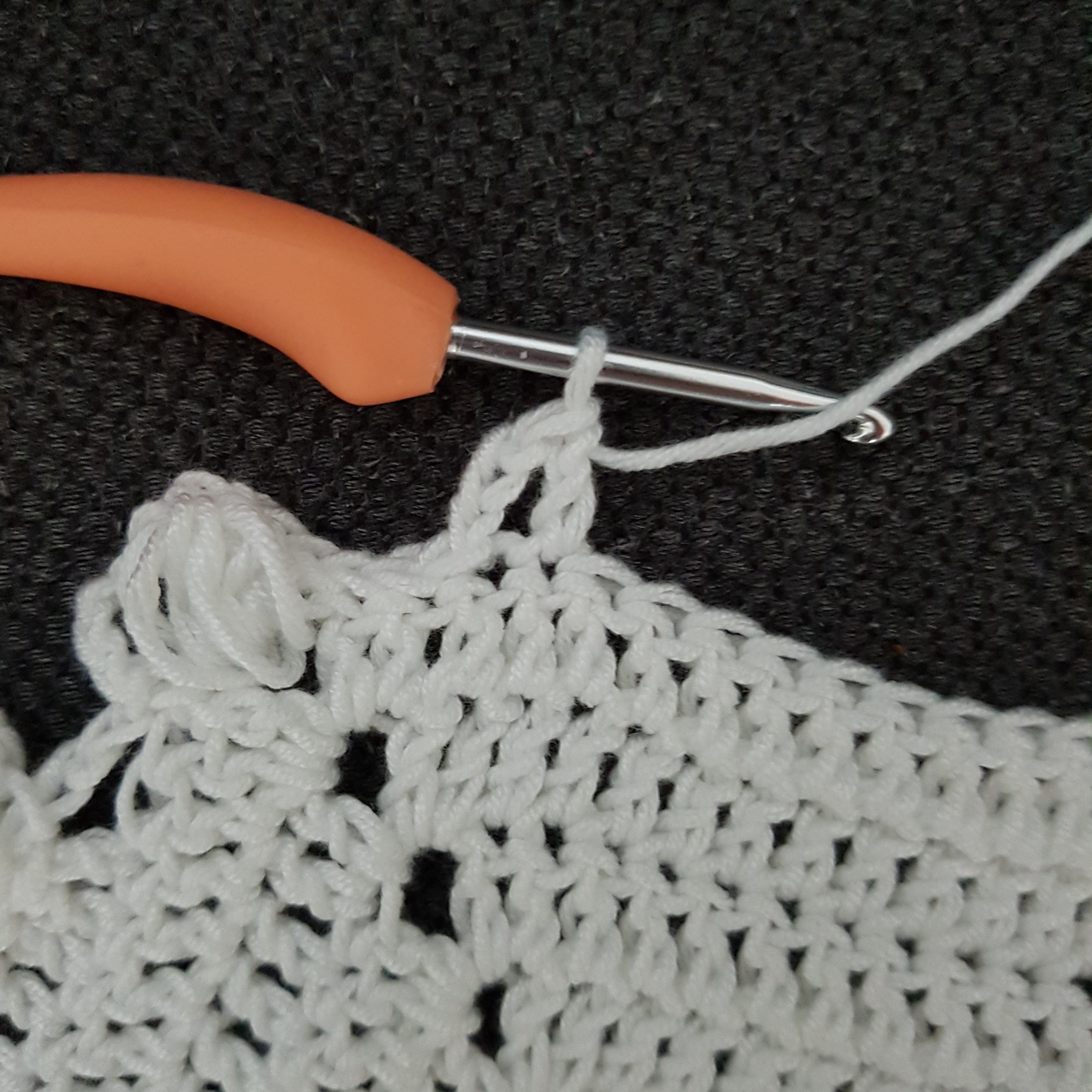 Haak 5 losse, haal de draad door de eerste steek en trek hem wat hoger op, sla draad om de naald en herhaal dit nog 4 keer, dan haal je de draad door alle lussen en sluit met een vaste. Haak 5 losse, haak een halve vaste in de eerste steek, haak 3 losse, haak 1 vaste in de hoek van de volgende rij. Herhaal tot je tot het midden van de top bent gekomen.