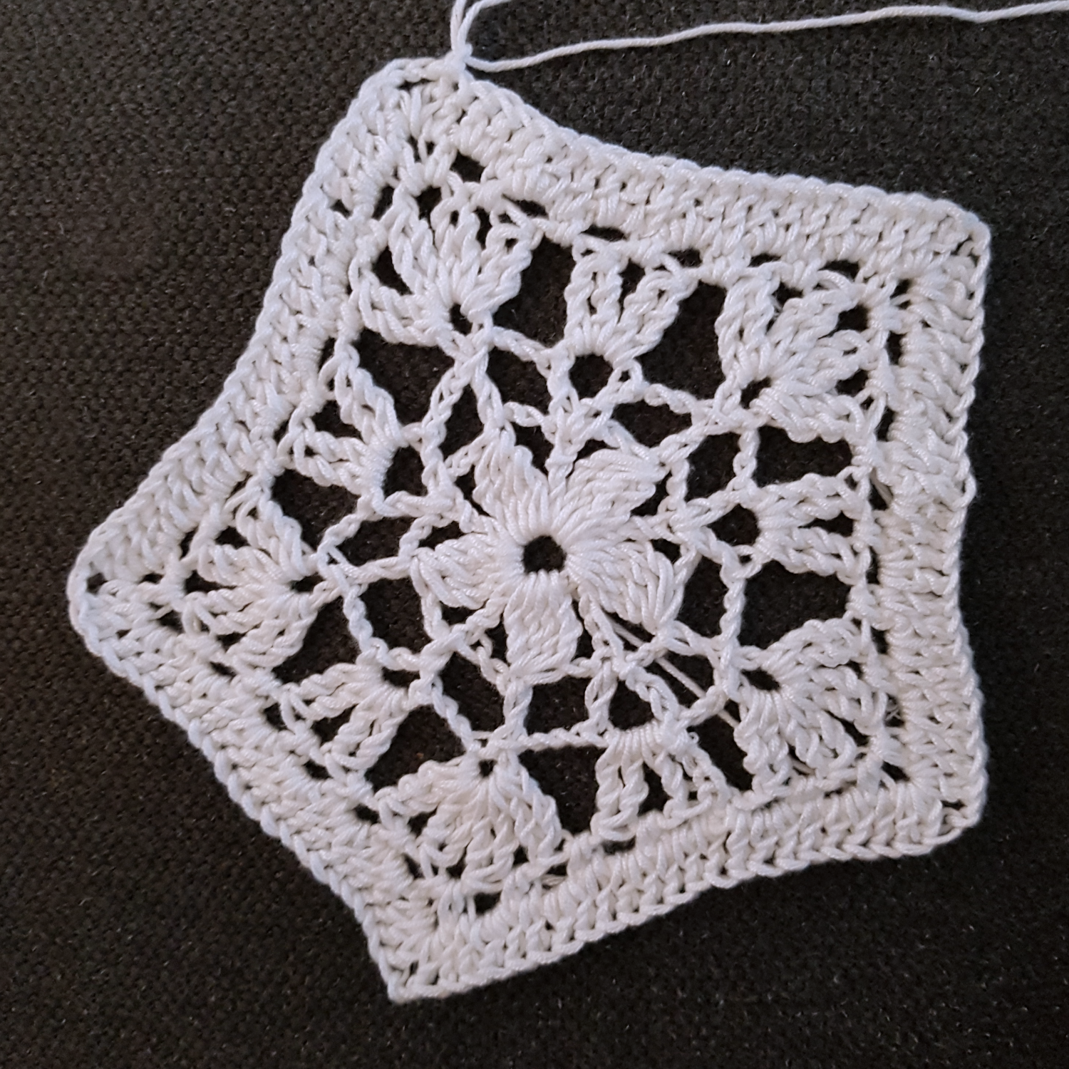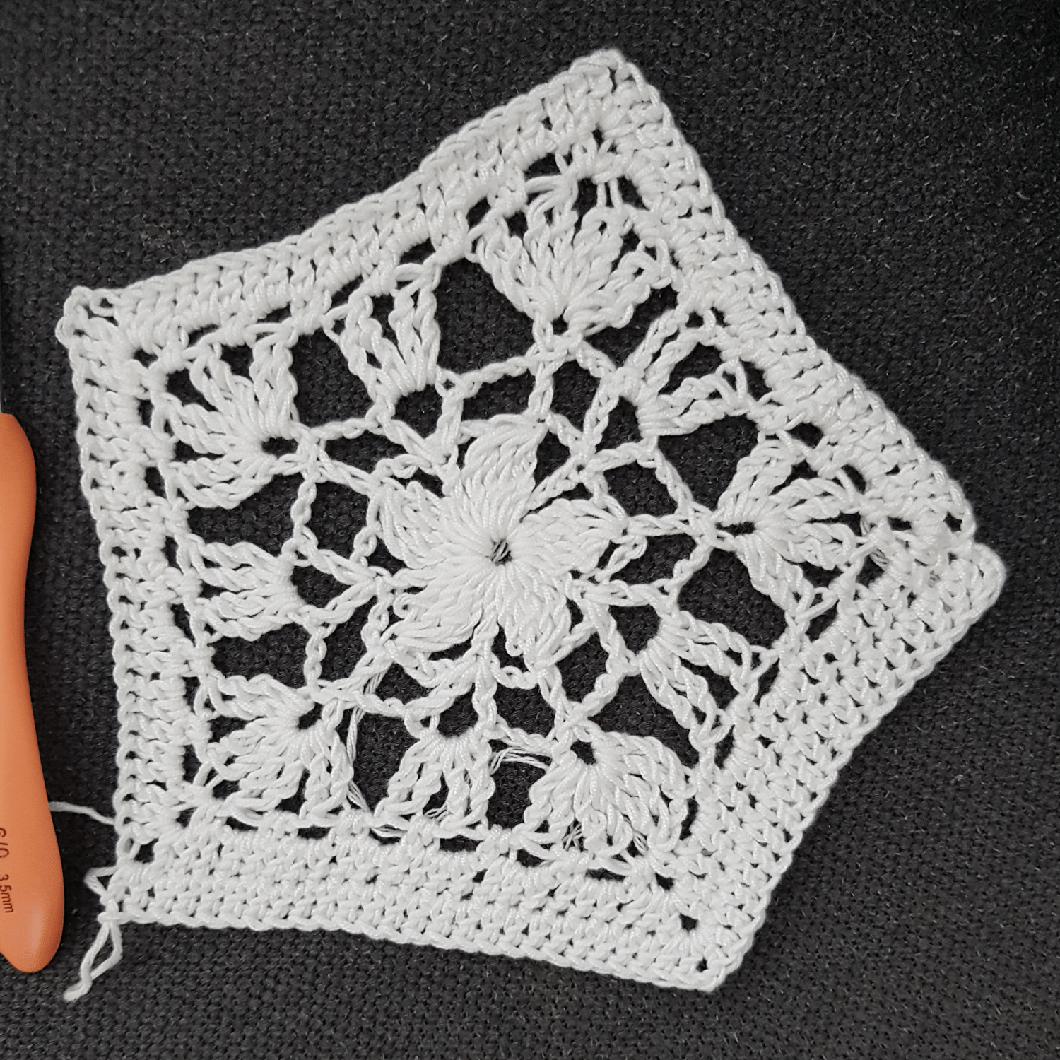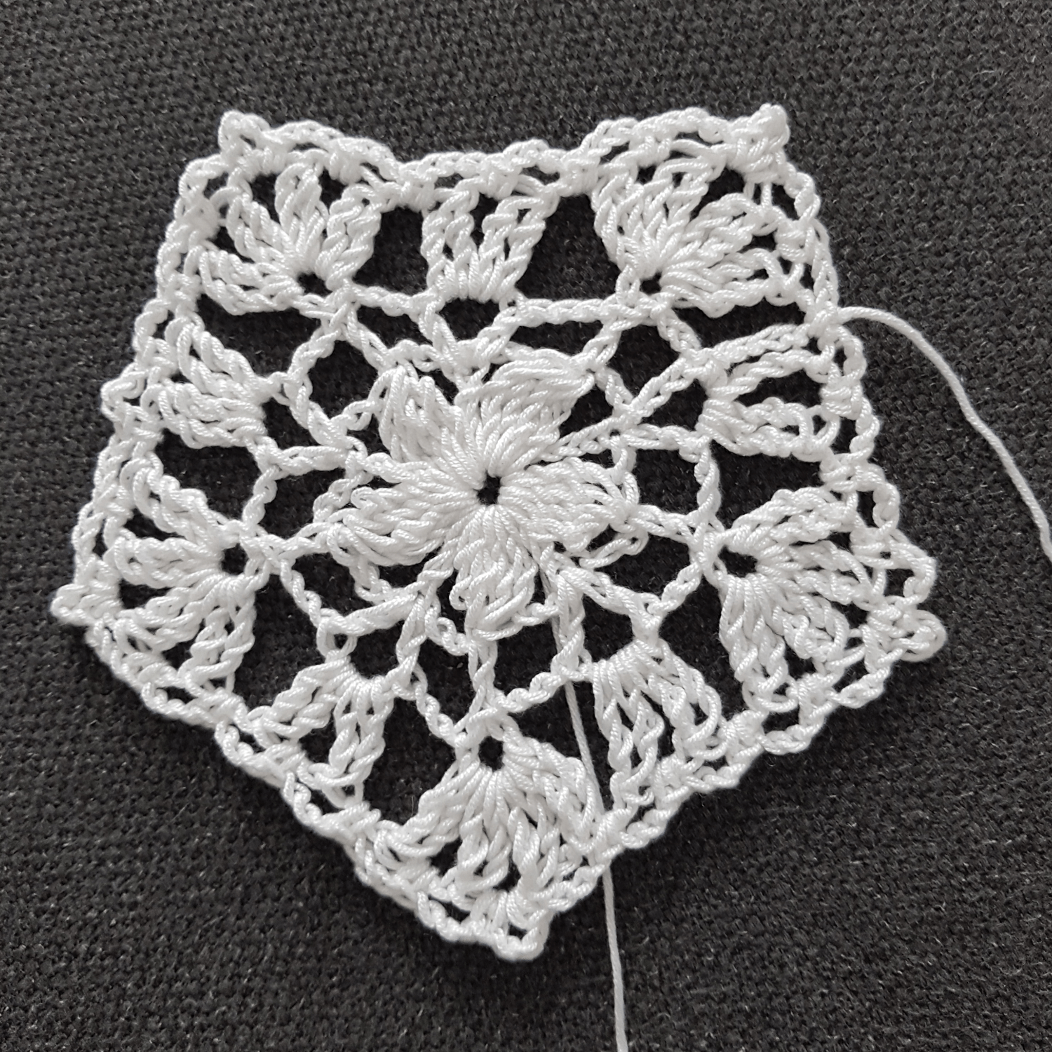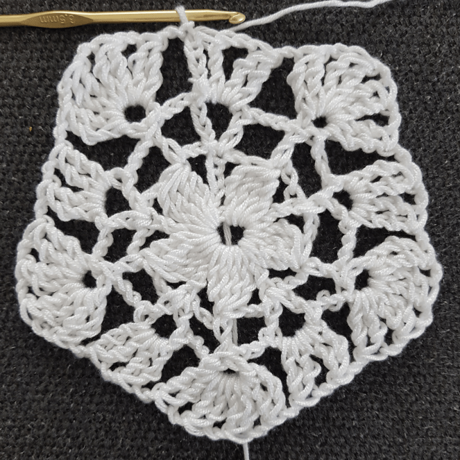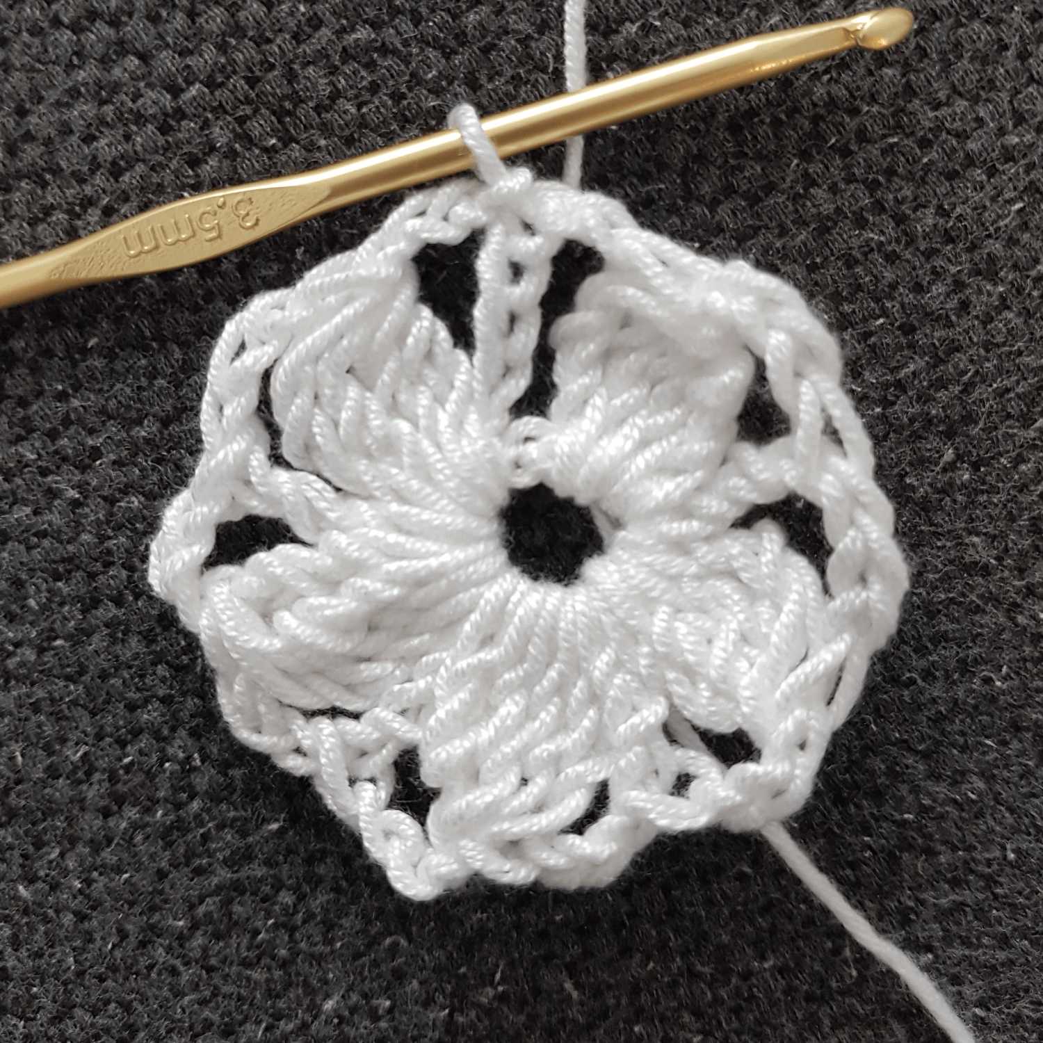 - Toer 5: haak 3 losse, 2 stokjes in 2 losse ruimte, 1 stokje in vaste, in hoek haak 2 stokjes, 2 losse, 2 stokjes. Herhaal dit rondom. Knip draad af maar laat een stukje over om het netjes weg te werken.