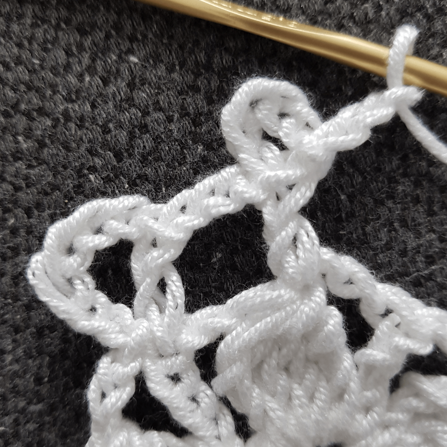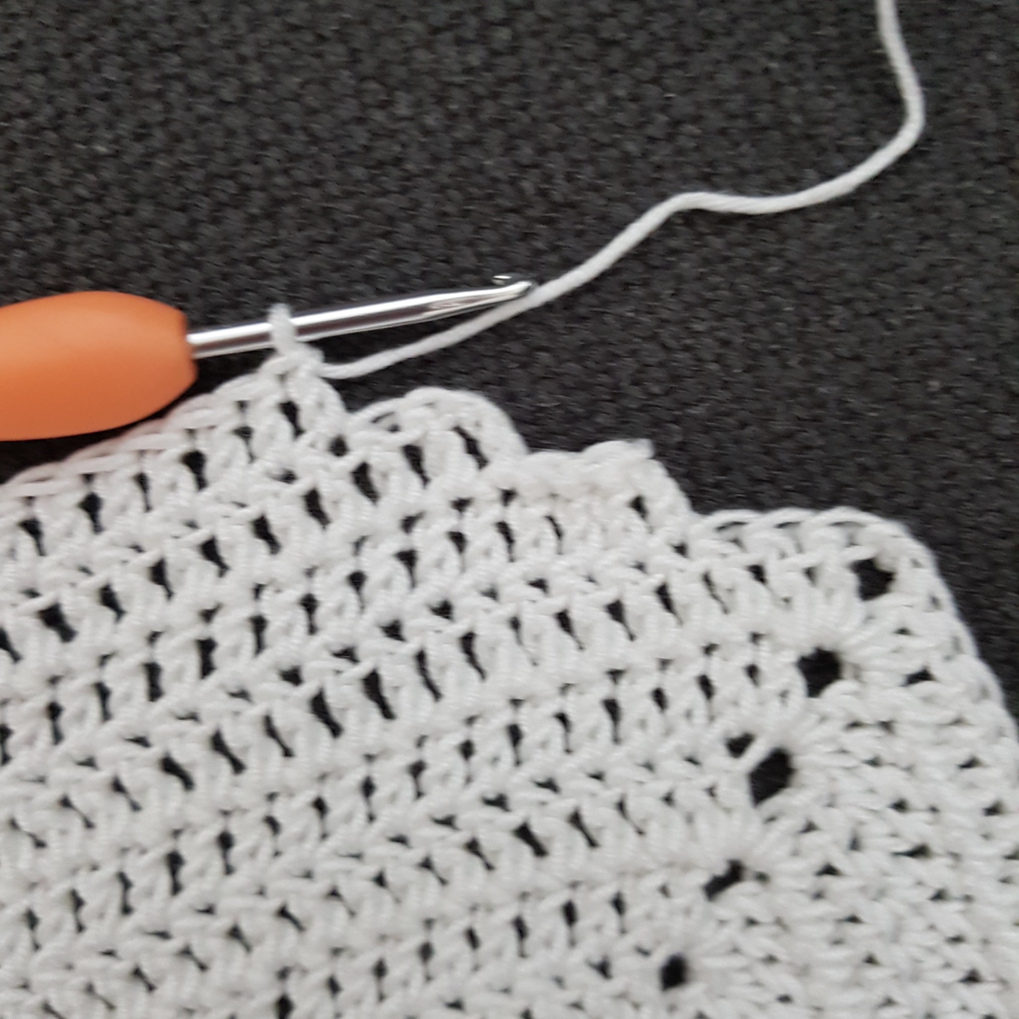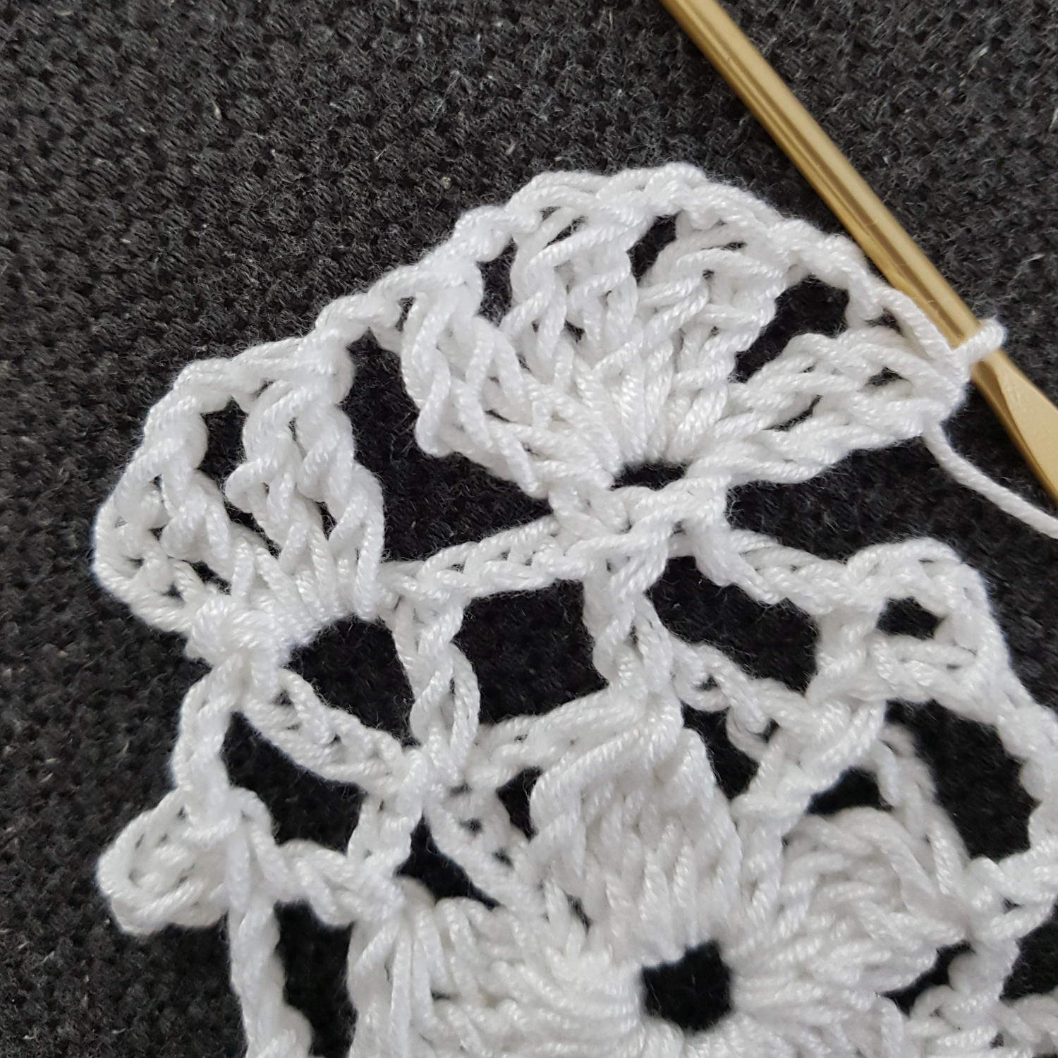 - Toer 4: haak 3 losse, 1 vaste in 2 losse ruimte, 3 losse, 1 vaste in volgende 2 losse ruimte, 3 losse, 1 vaste in hoek, 3 losse, 1 vaste in dezelfde hoek. Herhaal dit rondom. Sluit met een halve vaste.
