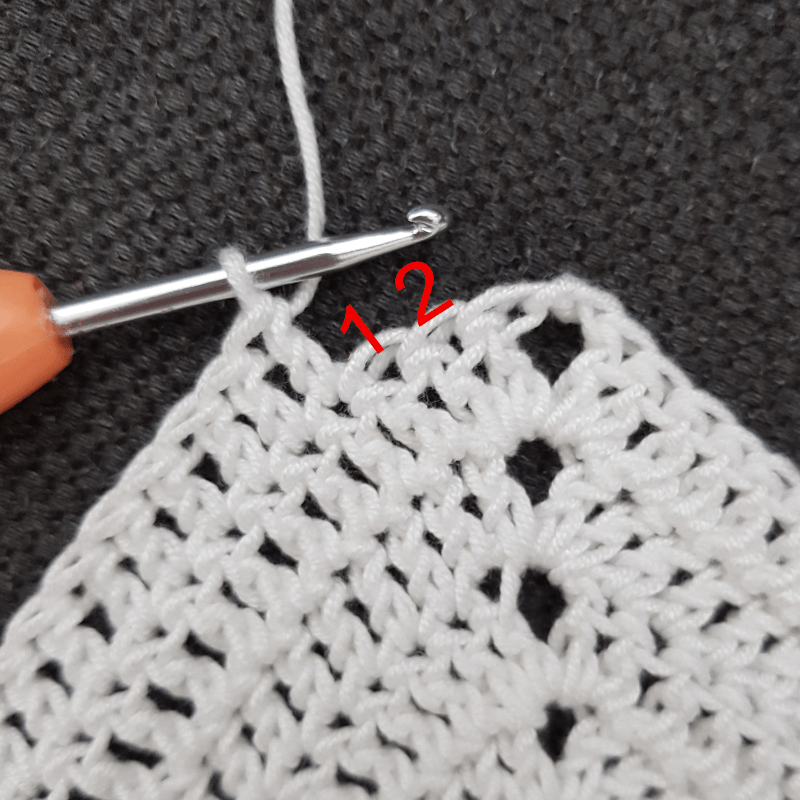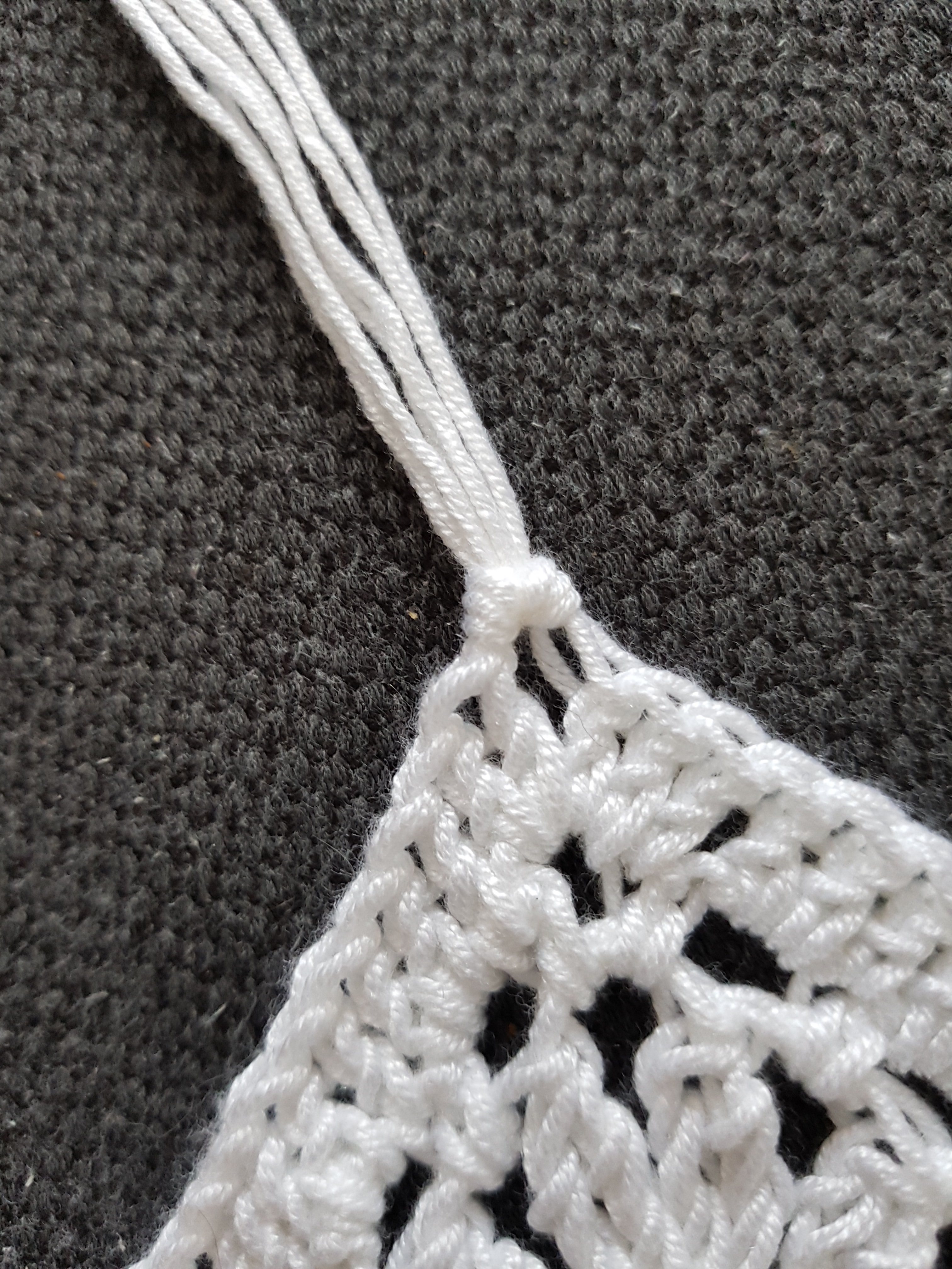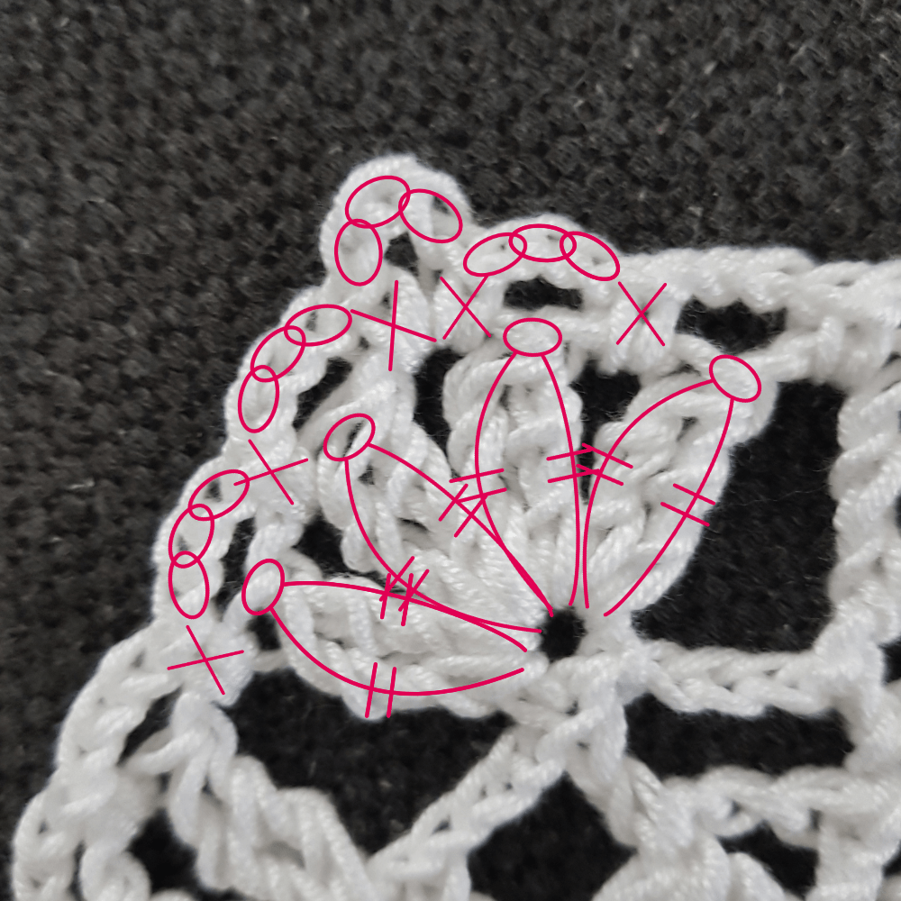 - Toer 4: haak 3 losse, 1 vaste in 2 losse ruimte, 3 losse, 1 vaste in volgende 2 losse ruimte, 3 losse, 1 vaste in hoek, 3 losse, 1 vaste in dezelfde hoek. Herhaal dit rondom. Sluit met een halve vaste.