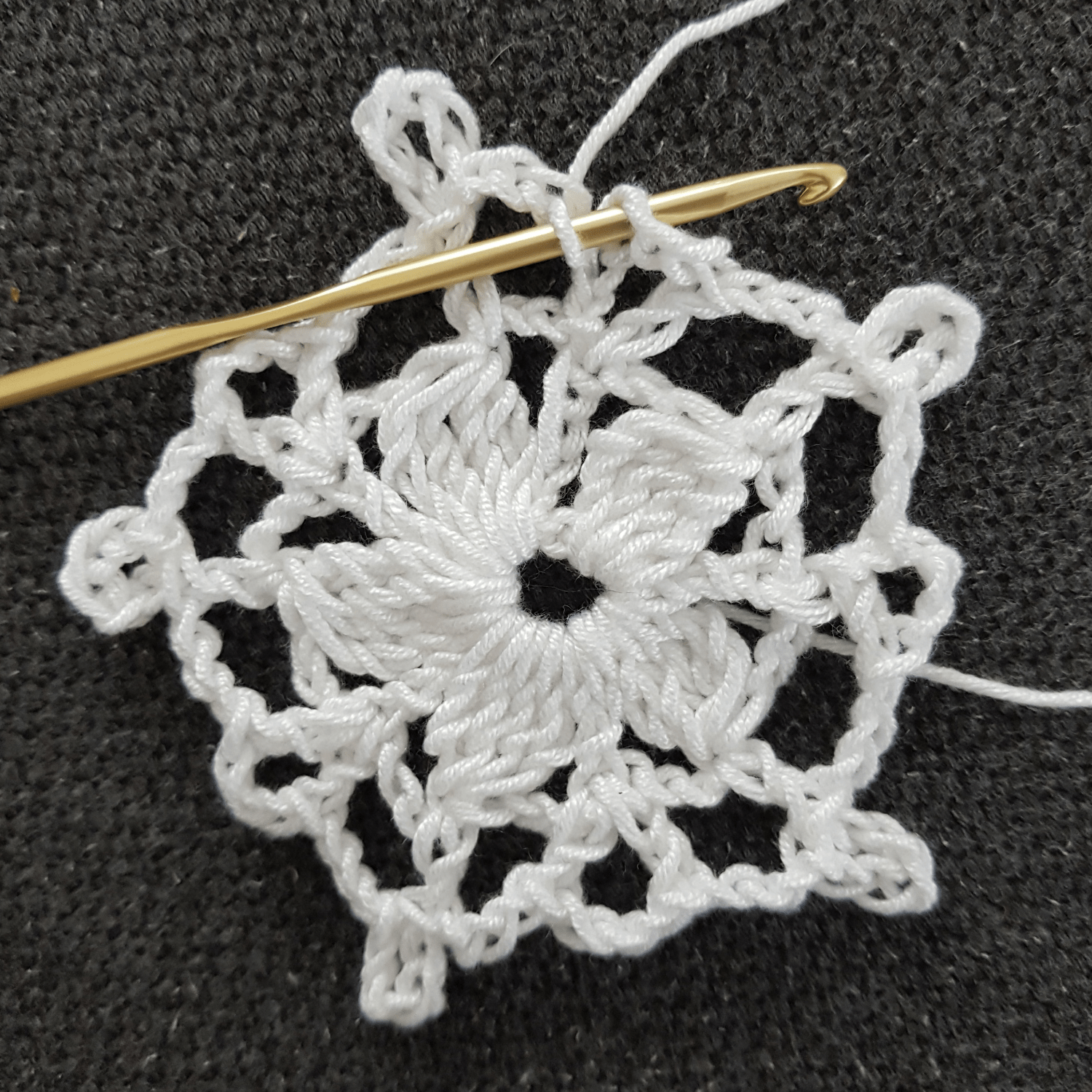 - Toer 2: haak 6 losse, 1 stokje in dezelfde steek. * 3 losse, 1 stokje bovenop cluster, 5 losse, halve vaste in eerste steek (picot), 3 losse, ( 1 stokje, 3 losse, 1 stokje) in dubbel stokje van vorige toer *, herhaal *.* 4 keer. Haak een halve vaste in de derde losse van het eerste stokje.