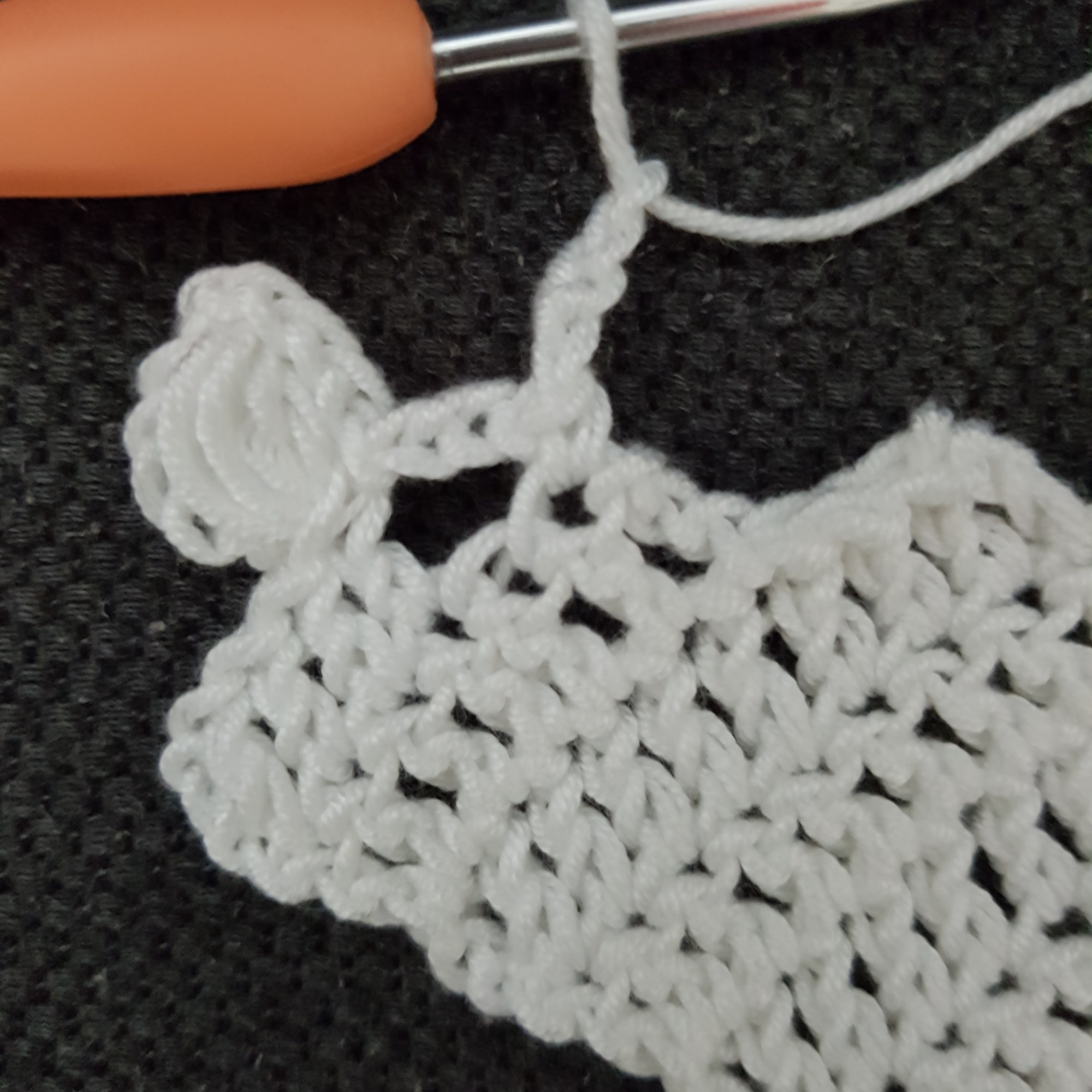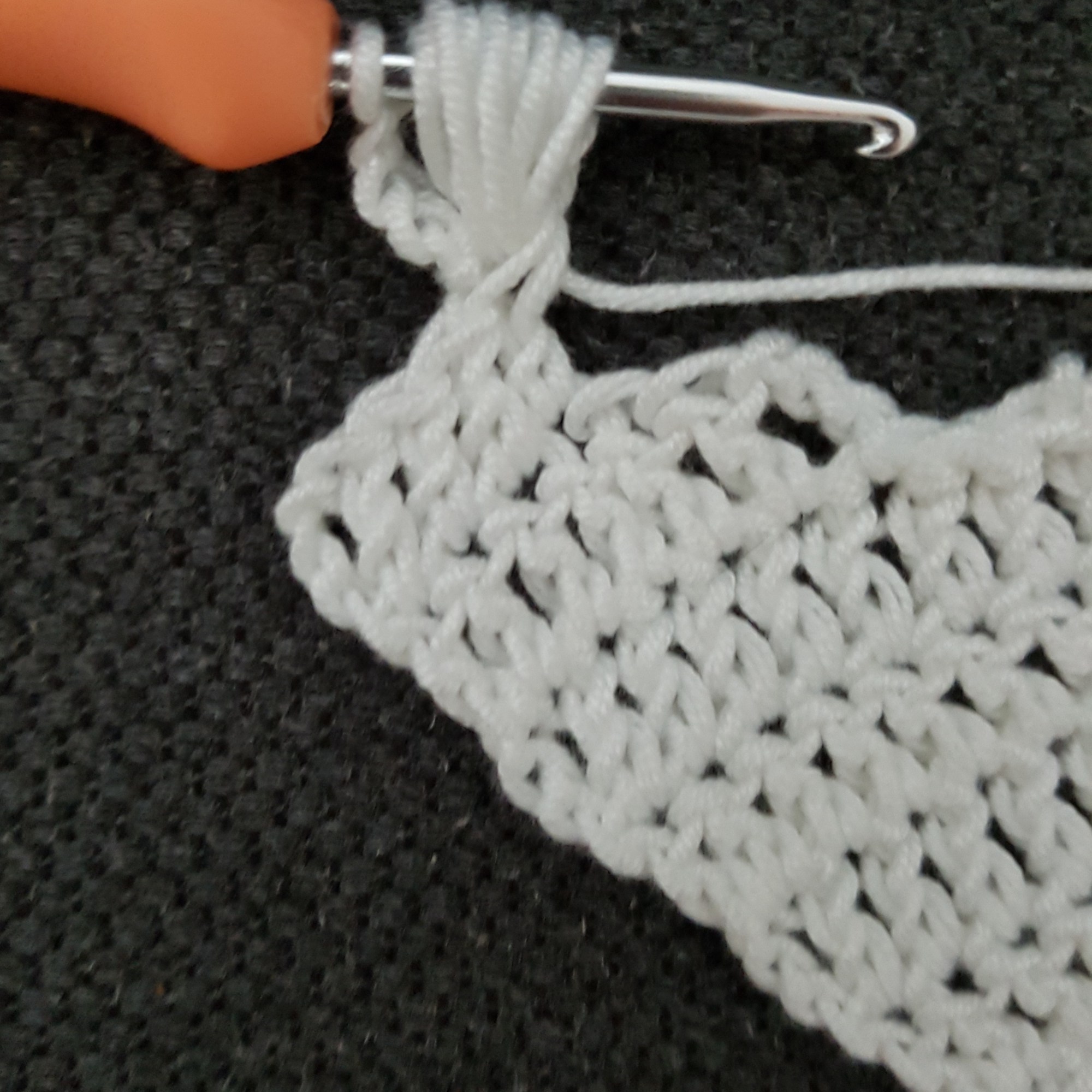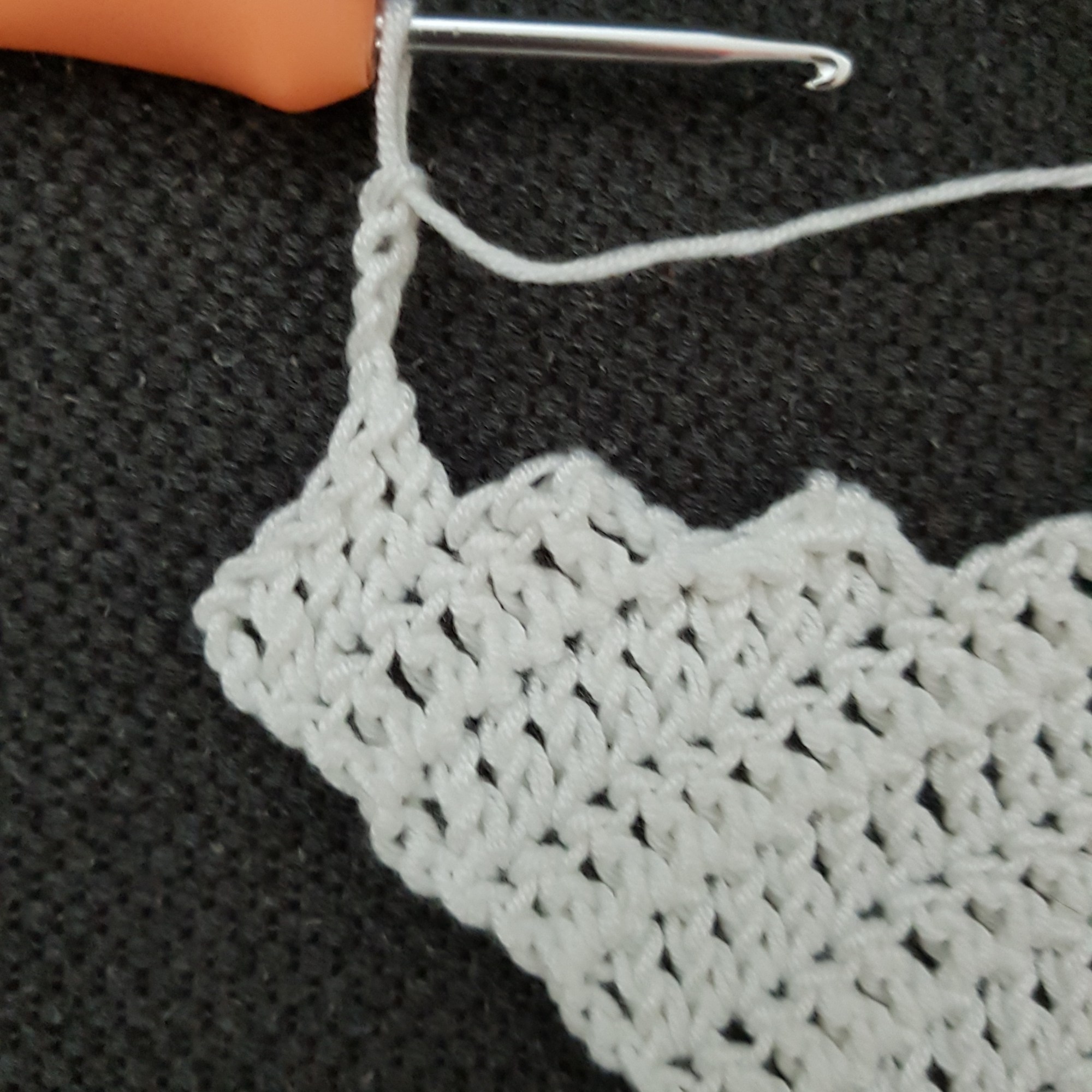 Aanbeland in het midden van de top ga je vanuit het midden een begin maken voor de andere kant. Haak halve vasten tot je bij het derde stokje bent aangekomen. Haak dan 3 losse, haak stokjes tot het einde. In de laatste steek haak 2 stokjes. Herhaal de toeren zoals bij de andere kant.
