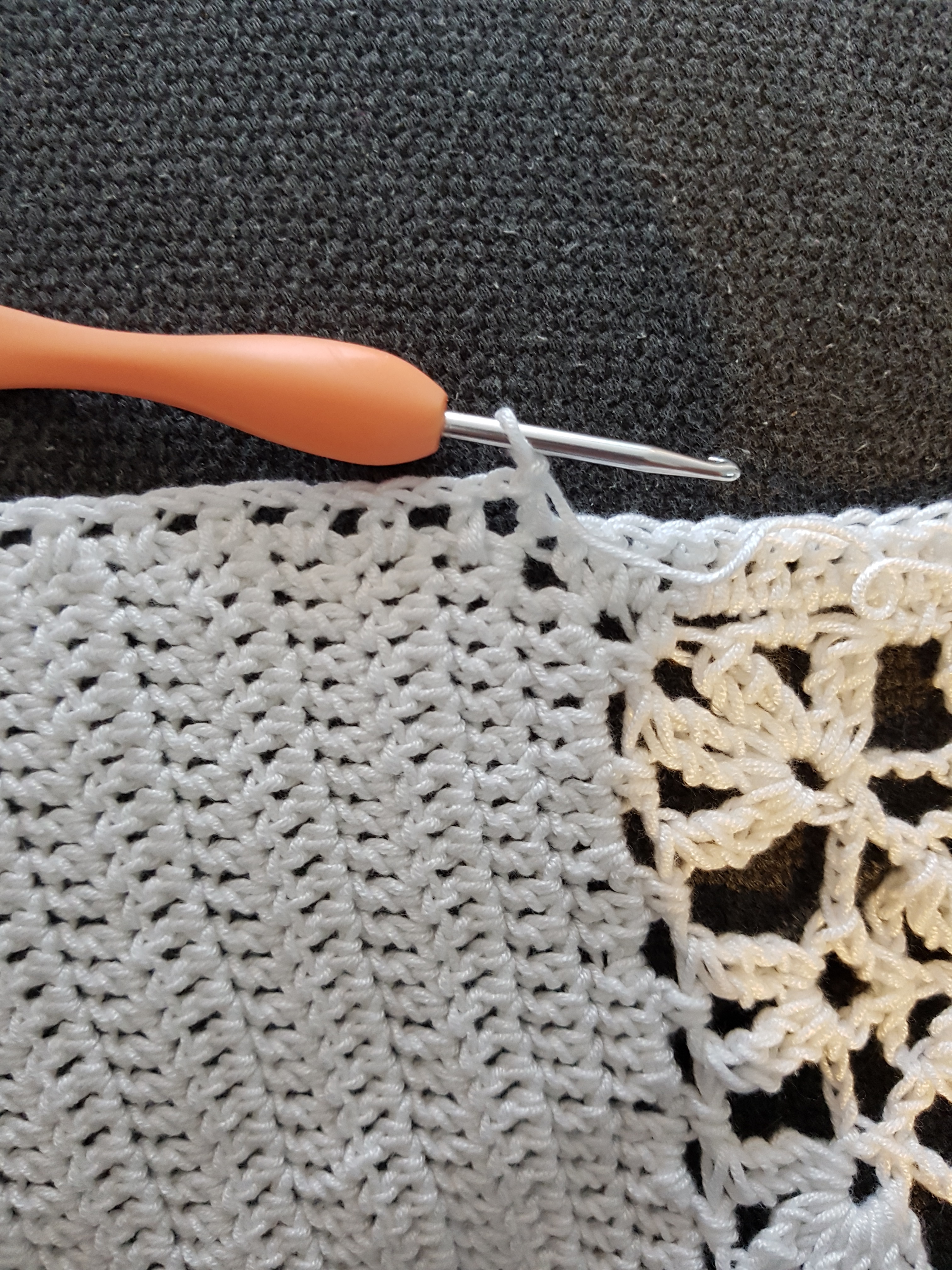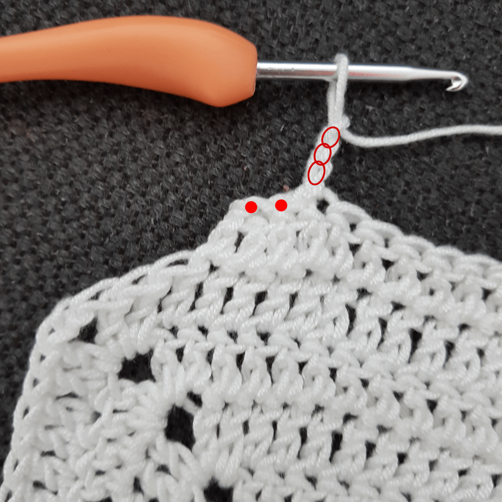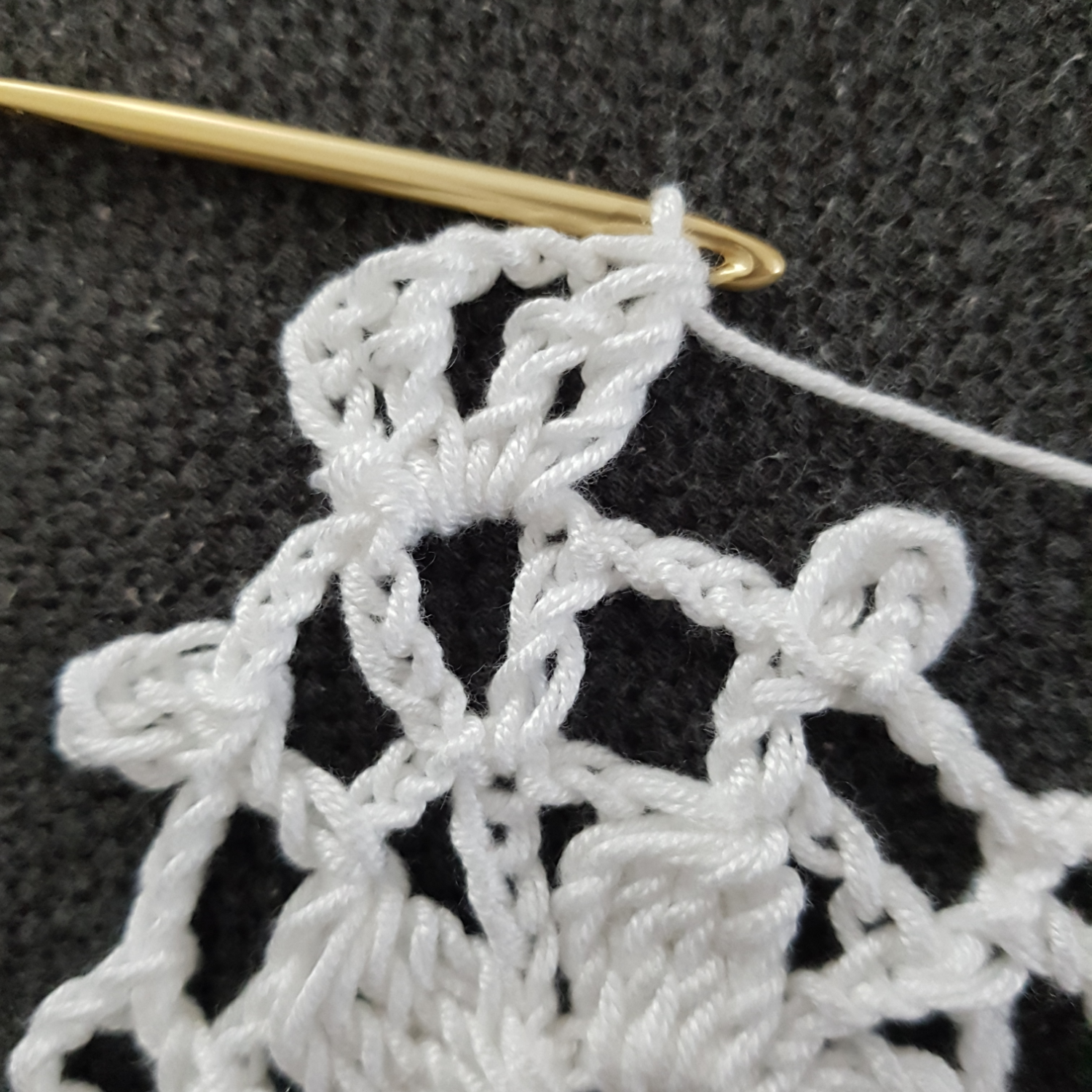 Aanbeland in het midden van de top ga je vanuit het midden een begin maken voor de andere kant. Haak halve vasten tot je bij het derde stokje bent aangekomen. Haak dan 3 losse, haak stokjes tot het einde. In de laatste steek haak 2 stokjes. Herhaal de toeren zoals bij de andere kant.