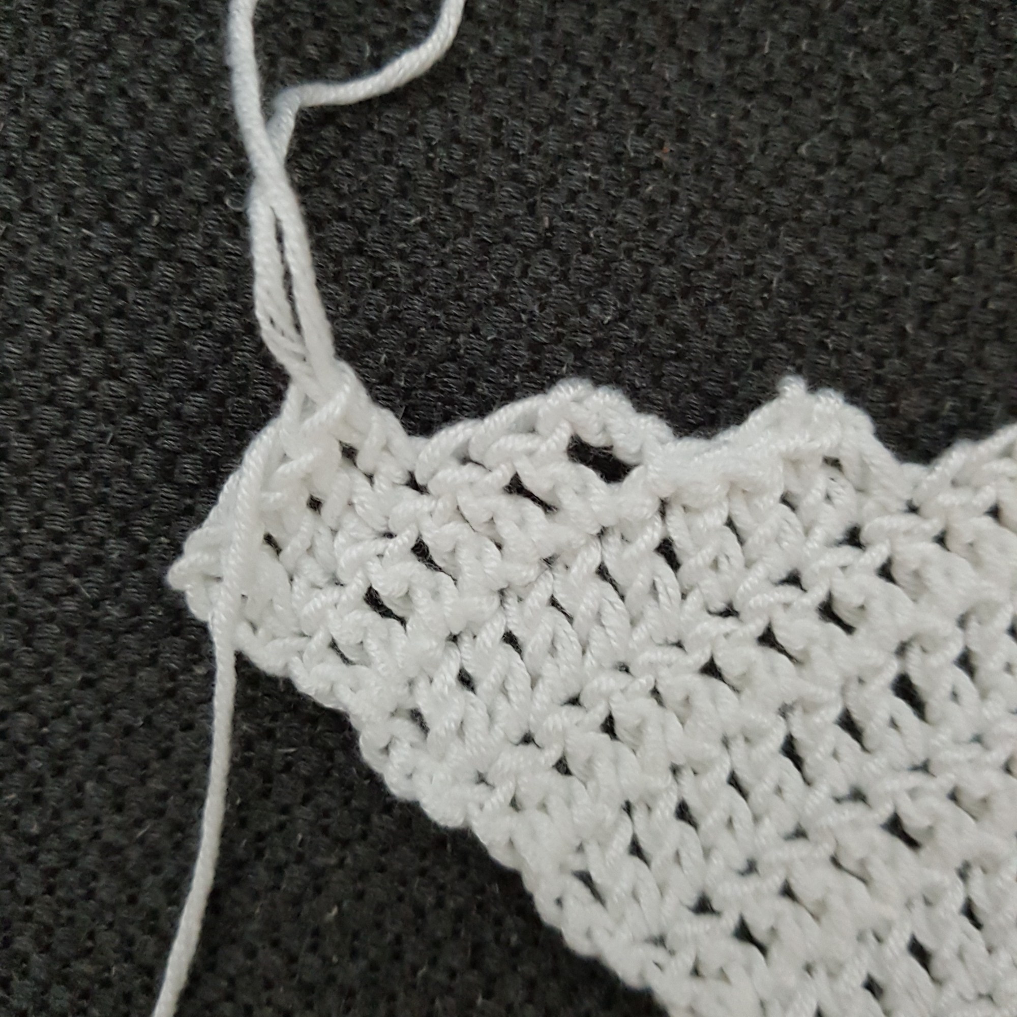 Wanneer je bij toer 10 bent, of de gewenste lengte, werk je stokjes tot het midden. *De laatste 2 steken laat je onbewerkt. Keer je werk. Haak halve vasten tot de derde steek. Haak 3 losse. Haak stokjes in elke steek tot het einde van de rij. Haak 2 stokjes in de laatste steek* herhaal deze toeren tot je 5 stokjes overhoudt.