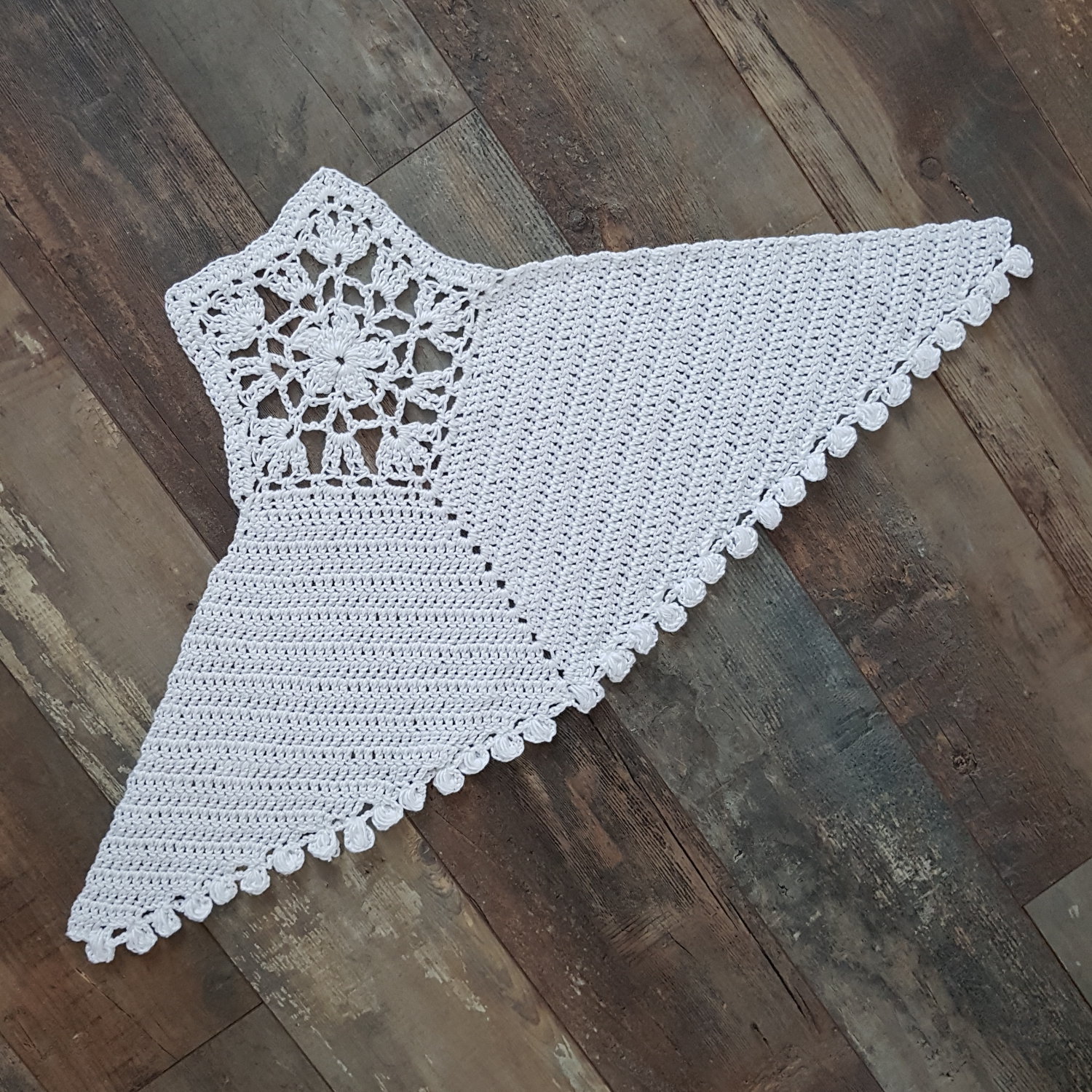 Maak onderin de hoek het garen vast en haak 4 losse, 1 vaste in de volgende rij, 3 losse, 1 vaste in volgende rij. Herhaal dit tot je bij het pentagram bent. Dan haak je een basisketting (filmpjes kan je vinden op YouTube en zie foto’s). Voor dit patroon haakte ik een basisketting (schouderbandje) van ca 80 cm lang. De lengte moet lang genoeg zijn aan beide kanten zodat je hem door de onderste hoeken kan weven en dan op je rug kan vastknopen. Kijk maar naar foto 4. Niet zo moeilijk denk ik.