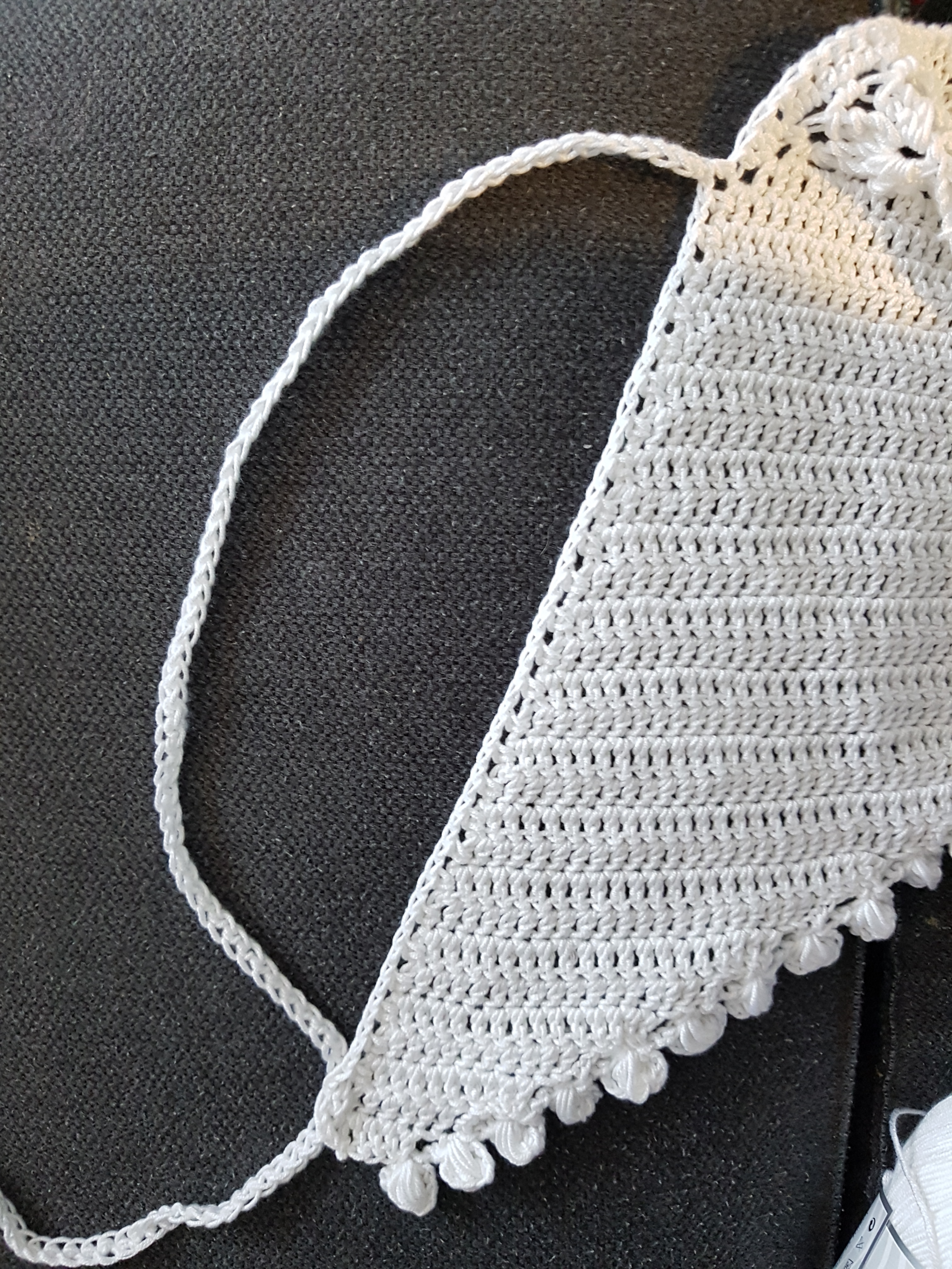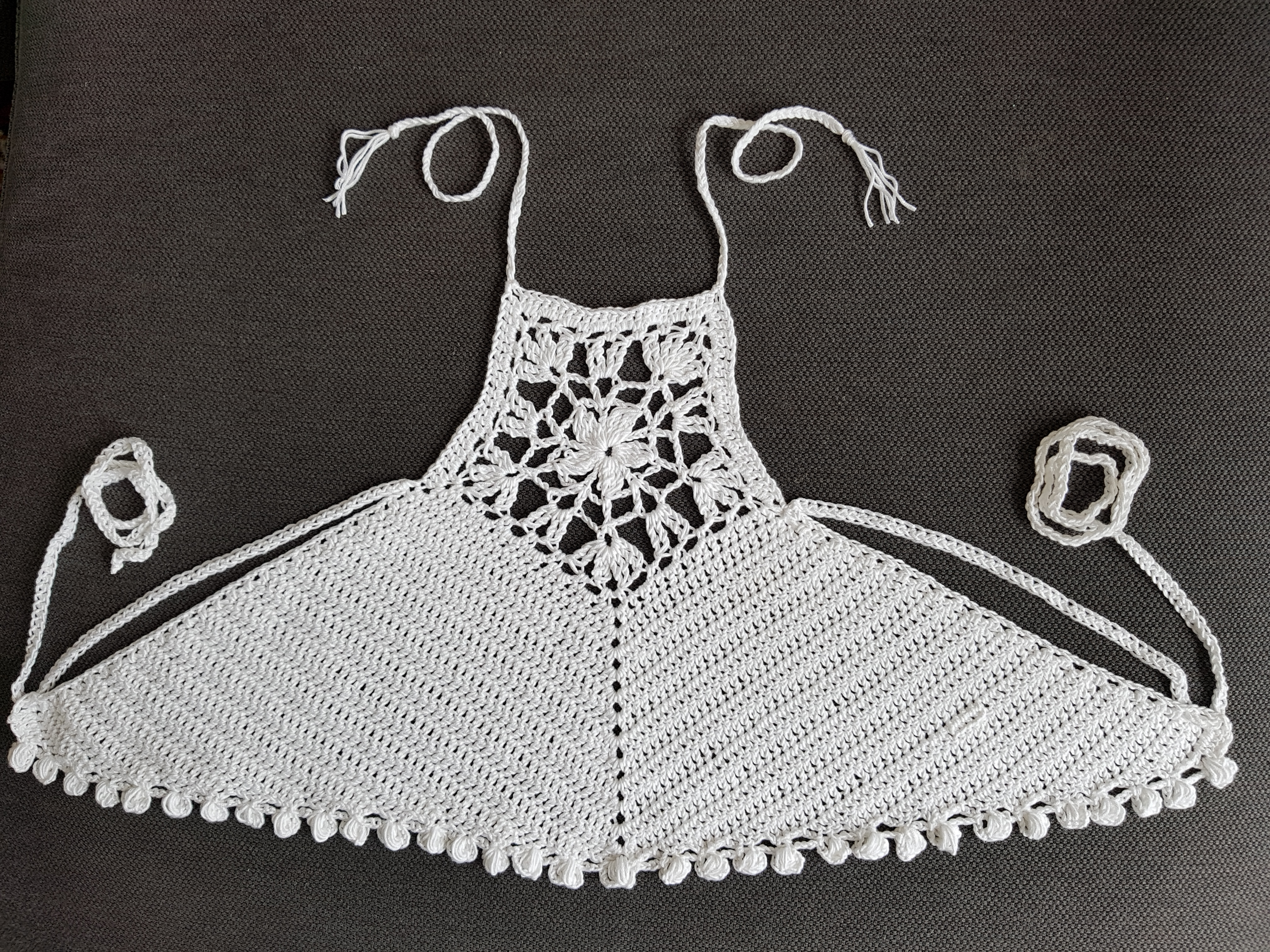 Zo ziet je topje eruit als beide zijden klaar zijn. Optioneel kunnen er schouderbandjes aan gemaakt worden. Zie foto waar de bandjes zitten. Je begint onderin de hoek en haakt langs de schuine zijde om deze netjes af te werken.